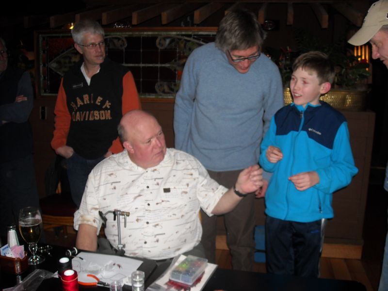 Club Vice President, Mike Donovan was in charge of the fly tying demonstration and showed how he ties a woven body nymph. Mike chose red and black embroidery thread for the body and tied a great looking little fly. Mike presented the fly to new club member Rowan seen in the picture. Rowan and his dad Aaron are a great addition to the club. Rowan also received a new fly box and some flies tied by club member Dick Powell who always donates his great flies for club functions.